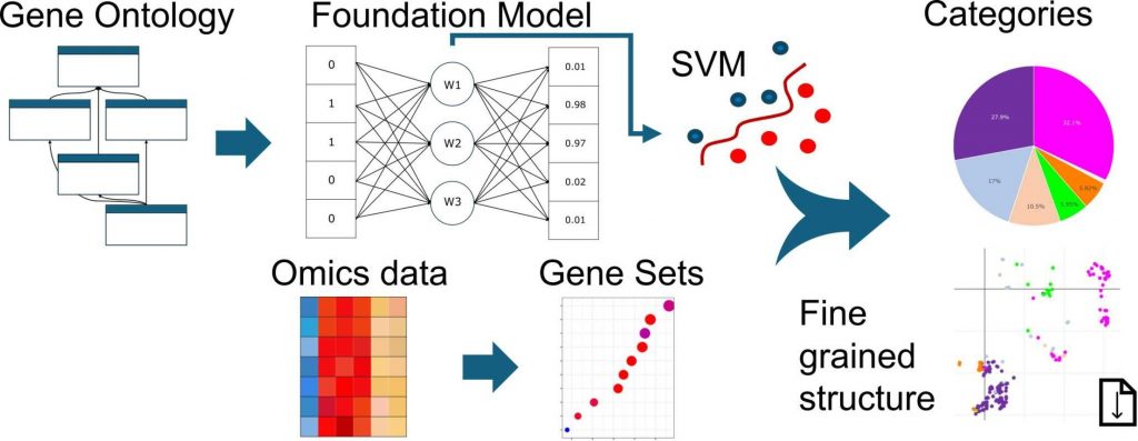 Gene Ontology (GO) is the most commonly used scientific knowledge base, providing functional annotations for gene sets. The ever-growing number of high-throughput biological experiments identifying differentially expressed genes (DEG) statistically enriched in those gene sets often results in long and redundant lists of GO terms. To facilitate the analysis and subsequently visualize trends within those lists of gene sets, we propose a database derived from a natural language processing-based machine learning algorithm that classifies GO terms into predefined higher-order groups. To support viral research, we predefined 18 such groups of higher-order annotation and provided a database of categorized GO terms tailored to characterize the behavior of biological systems in the context of viral infection.